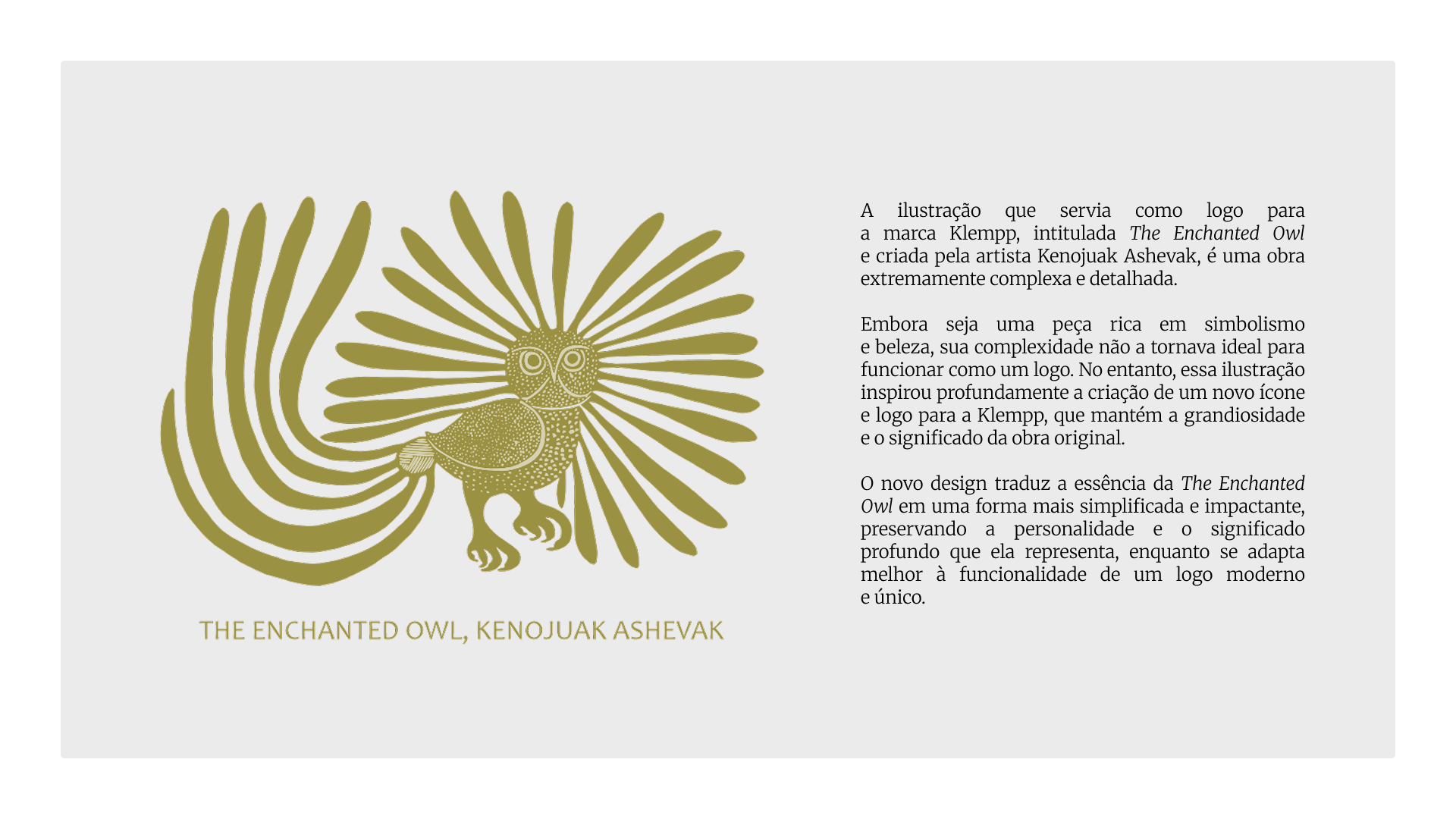 Klempp Advogados is a brand identity project developed for a law firm focused on ethics, clarity and strategic visual communication. The entire identity was inspired by the symbolic strength of The Enchanted Owl by Inuit artist Kenojuak Ashevak, reinterpreted into a simplified and functional symbol that aligns with the legal context. The visual identity includes a custom typeface, a professional color palette combining deep blue and soft gold, and graphic elements that create a balanced language between elegance and tradition. The owl symbol reinforces values such as wisdom, observation and trust, essential for a contemporary law firm. Applications include logo design, symbol design, brand system, legal stationery, website mockups, document templates and social media content. The project highlights the potential of visual storytelling and editorial clarity in legal and corporate branding. Keywords: brand identity, logo design, law firm branding, legal design, owl symbol